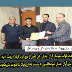 تقدیر از بانوان تکواندو کار شهرستان آران و بیدگل مقام آور در لیگ پومسه کشور با حضور ابوذر فرد نژاد رئیس اداره ورزش و جوانان، مصطفی آسیابی رئیس هیات تکواندو...