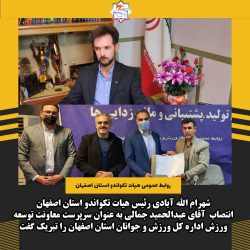 شهرام الله آبادی رییس هیأت تکواندواستان اصفهان،طی پیامی ضمن تشکر از زحمات جناب آقای حسین زیبایی معاون سابق اداره کل در زمان تصدی،انتصاب آقای عبدالحمید جمالی به عنوان سرپرست معاونت...